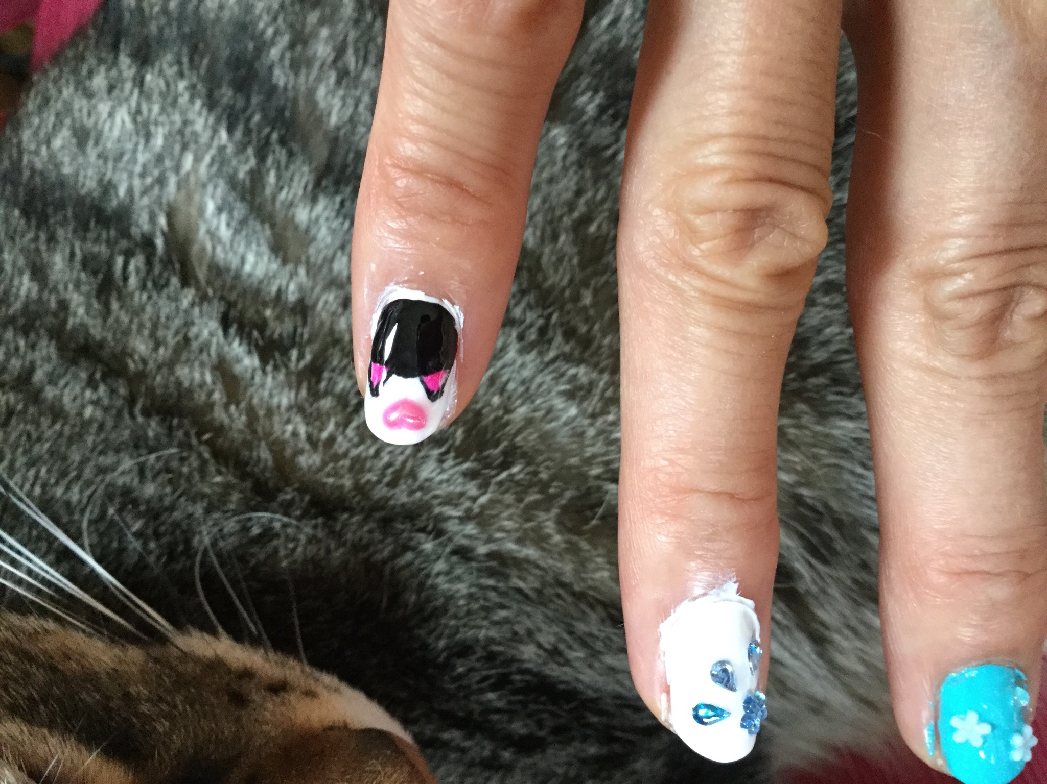 小指はねこちゃんです。指の下は本物の猫です。