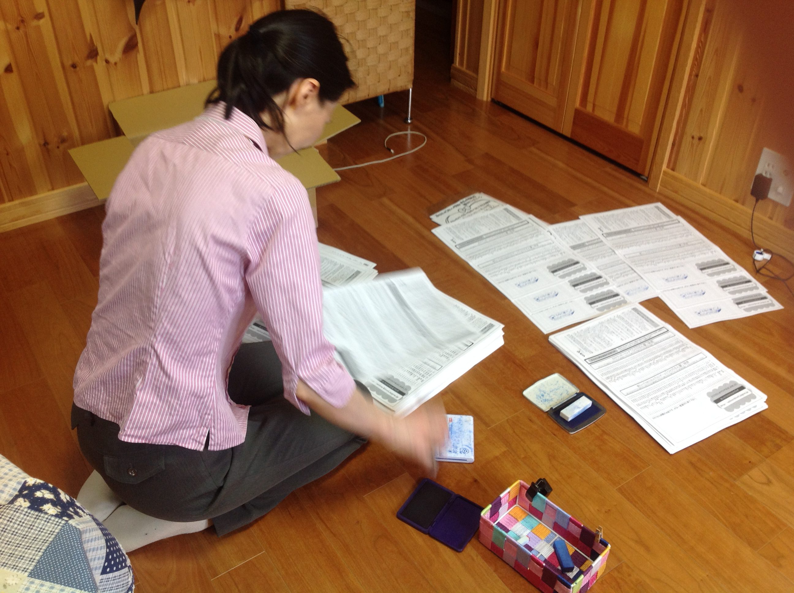 今日はお昼前から、いつも、はんこ押しを手伝ってくれる芳子ちゃんが、来てくれました。毎回、ぺこんぺこんとはんこを押して、その後、近所に配ってくれます。ほんとうにありがたいんです。