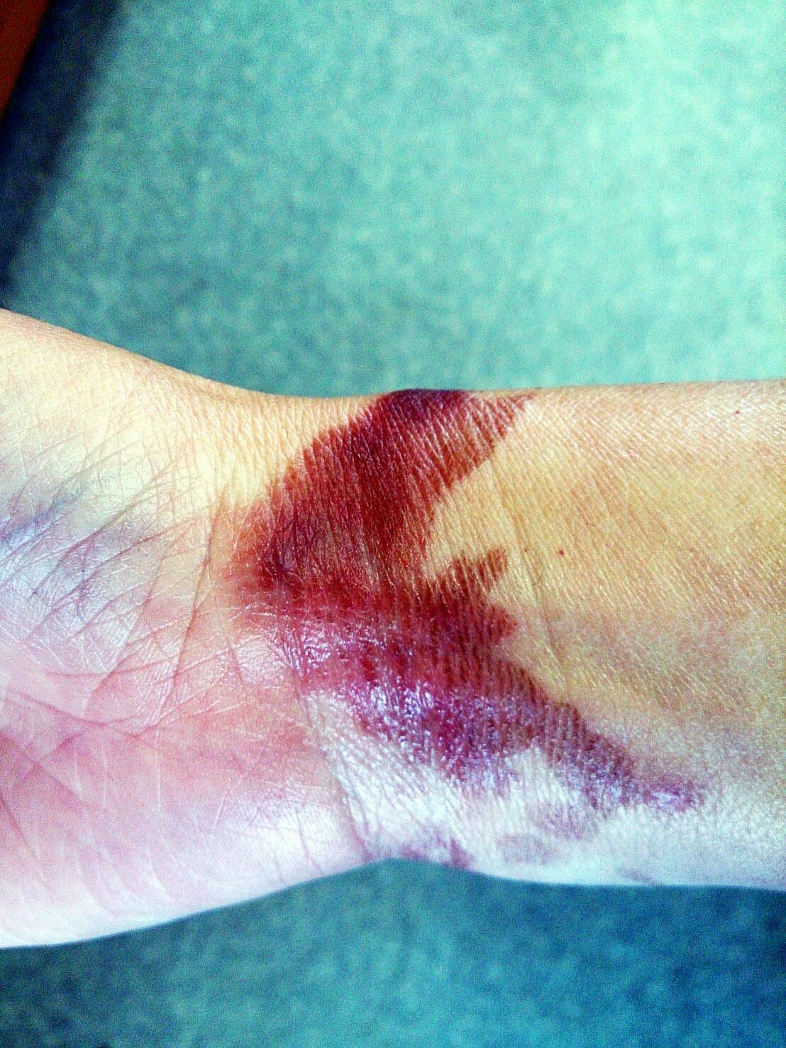 これは、絵の具で色をつけたわけじゃありません。料理中に油で火傷、してしまったかずぴぃーの腕です。