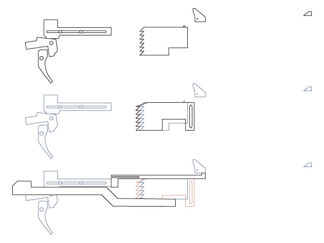 階層構造 ボルトアクションゴムライフル 2010-07-24 inoma 一番上の絵が中心部、それ以降二層目、三層目と板が重なって居る感じです。 裏側にもあるので今のところ5層。メカボックスの改装を入れると7層か? 各部が干渉しないようにスライドすることで動作する感じで。 いのま